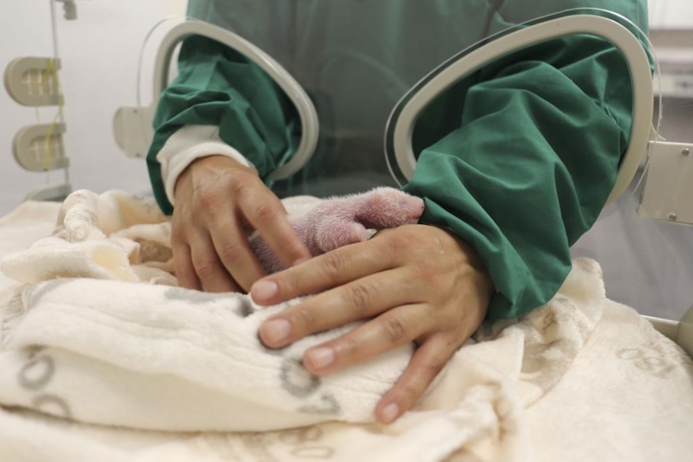 Currently deaf, blind and pink — their black-and-white panda markings will develop later — the firstborn twin now weighs 180 grams, while the second is roughly 145 grams (6.35 and 5.11 ounces). Both have regained their birth weights and added more grams, which the zoo considers a promising sign. The cubs’ sexes have not yet been determined “with certainty.”
