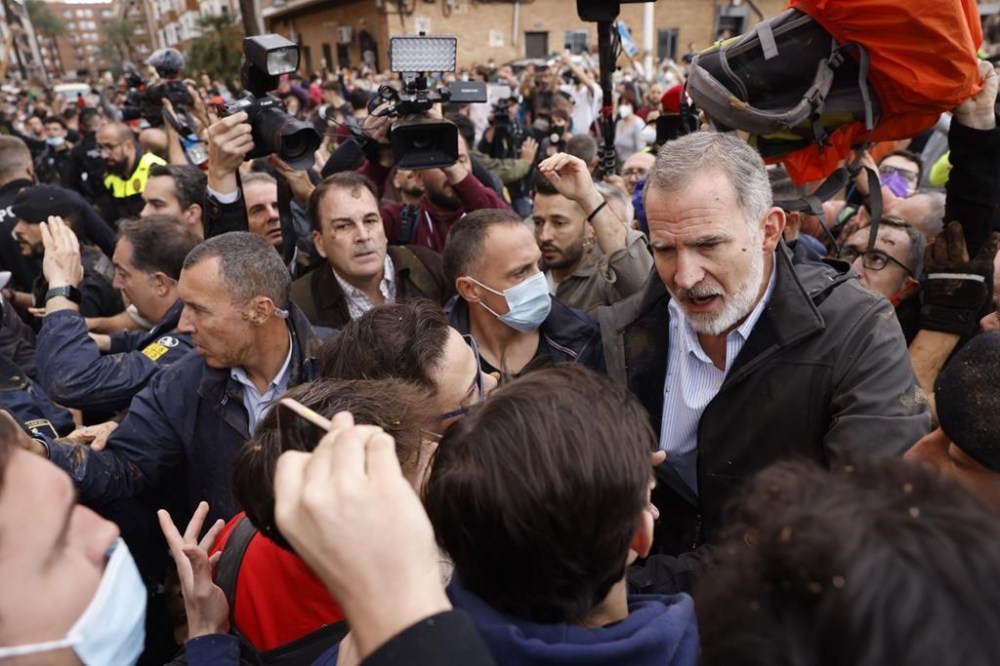 But even after being forced to seek protection, King Felipe VI, with flecks of mud on his face, remained calm and made several efforts to speak to individual residents. He insisted on trying to speak with people as he tried to continue his visit. He spoke to several people, patting two young men on their backs and sharing a quick embrace, with mud stains on his black raincoat.