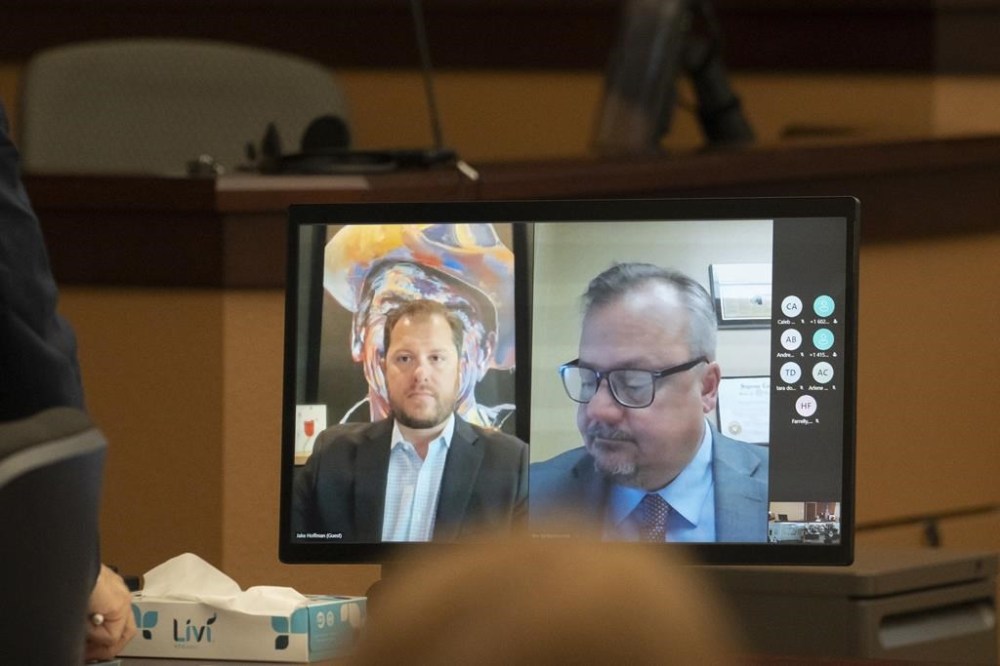 FILE - Arizona Rep. Jake Hoffman, R-Queen Creek, left, and his attorney Timothy La Sota appear virtually for Hoffman's arraignment in Maricopa County Superior Court in Phoenix, June 6, 2024. (Mark Henle/The Arizona Republic via AP, Pool, File)