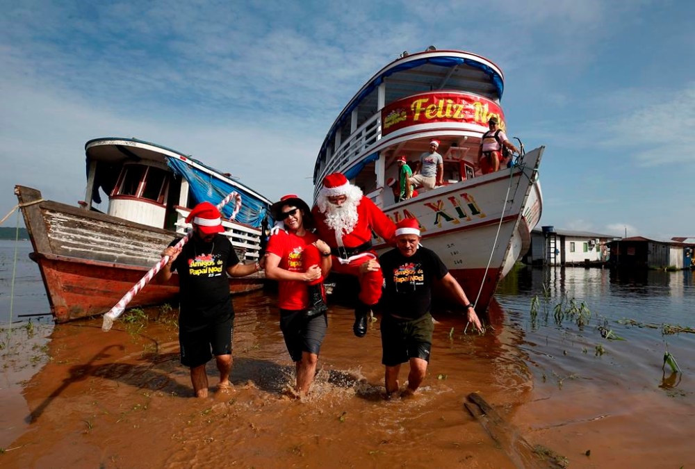 CATALAO, Brazil (AP) — Santa Claus braved the sticky heat of the Amazon rainforest this weekend, taking two boats to bring gifts to children in a village near the Brazilian city of Manaus.