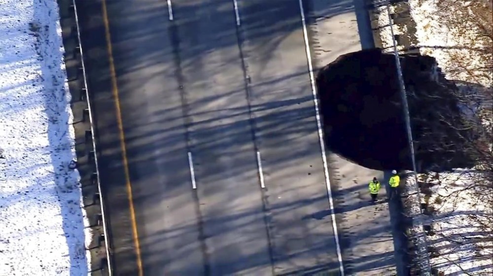 The highway’s guardrail still hung suspended in the air across the gaping 40-foot-wide (12-meter) hole, which opened up when an abandoned mine collapsed under the highway’s right shoulder Thursday morning, according to the New Jersey Department of Transportation.