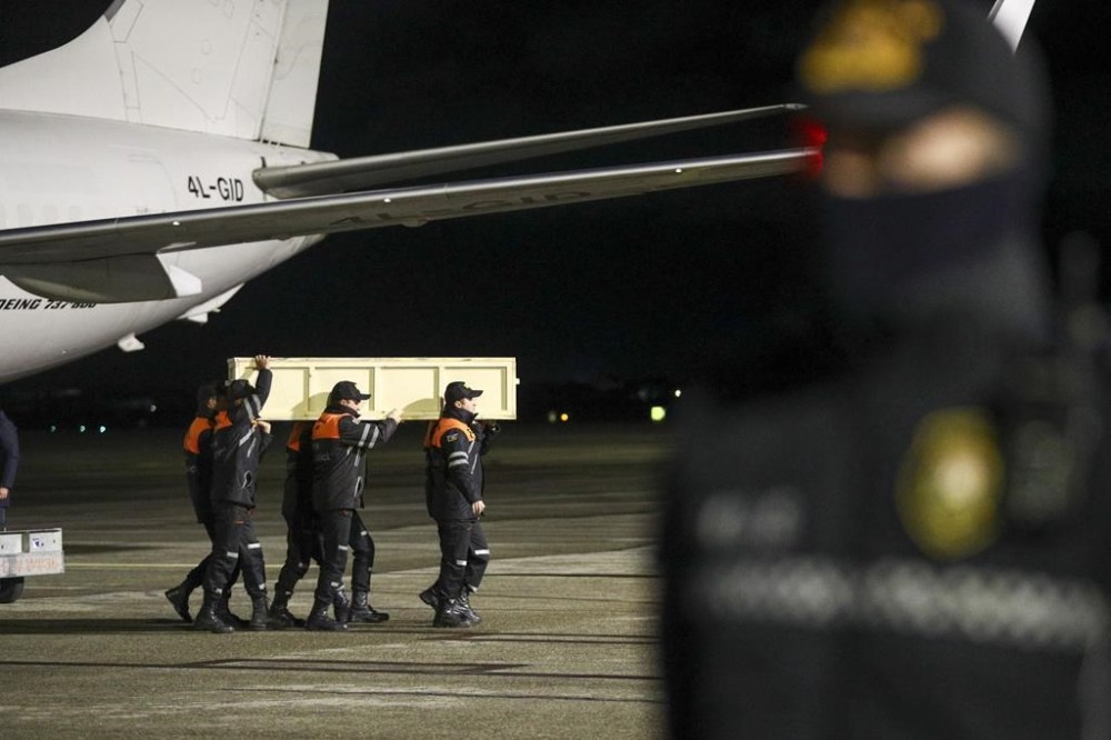 Workers carry a coffin with a body of a victim from a plane after the Azerbaijani Airlines crashed, near the Kazakhstani city of Aktau, upon their arrival at the Heydar Aliyev International Airport outside Baku, Azerbaijan, on Saturday, Dec. 28, 2024. (AP Photo)