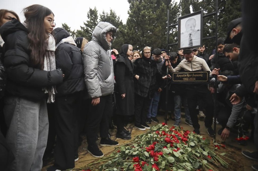 People stand at the grave of pilot in command Igor Kshnyakin during a funeral of the crew members of the Azerbaijan Airlines Embraer 190 killed in a deadly plane crash in Kazakhstan this week, at the II Alley of Honor in Baku, Azerbaijan, Sunday, Dec. 29, 2024. (AP photo)