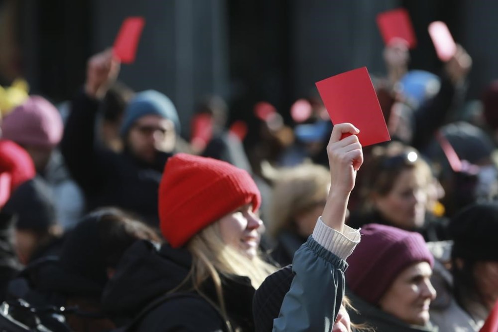 Protesters in front of the parliament building on Sunday held red cards, in reference to Kavelashvili’s career in soccer.