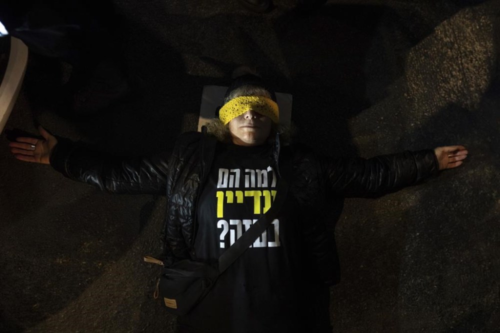 She spoke to The Associated Press on a dusty road in the southern city of Khan Younis beside the rubble of a destroyed building. Behind her, a sea of makeshift tents filled with displaced families stretched into the distance.