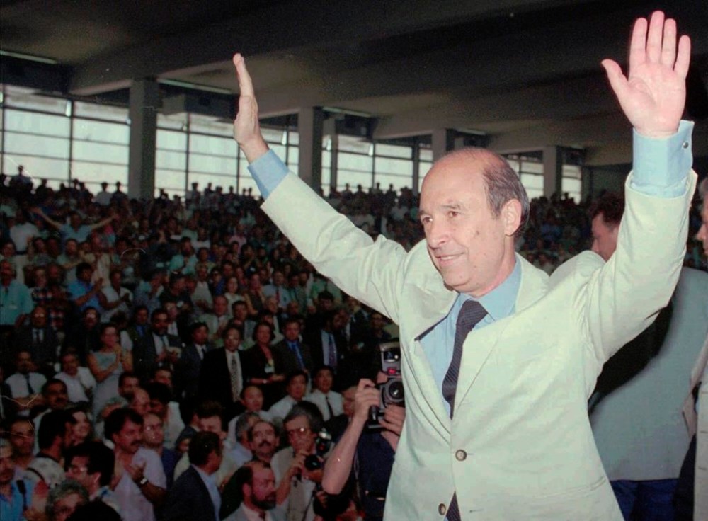 FILE - Then Greek Premier Costas Simitis, waves to ruling Socialist party's congress delegates shortly before the start of his speech in Athens on Thursday June 27, 1996. Costas Simitis, a Prime Minister of Greece from 1996 to 2004 and the architect of the country's joining the common European currency, the euro, has died at 88, state TV ERT reports. (AP photo/ Aris Saris, File)