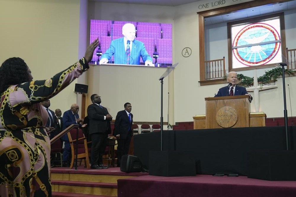 After commenting on the ceasefire, Biden and first lady Jill Biden took their seats in the front pew at the church. At least several hundred congregants sang gospel songs, rising to their feet and swaying and clapping. A choir led the musical selections from behind the pulpit before the program later shifted to focus on King.