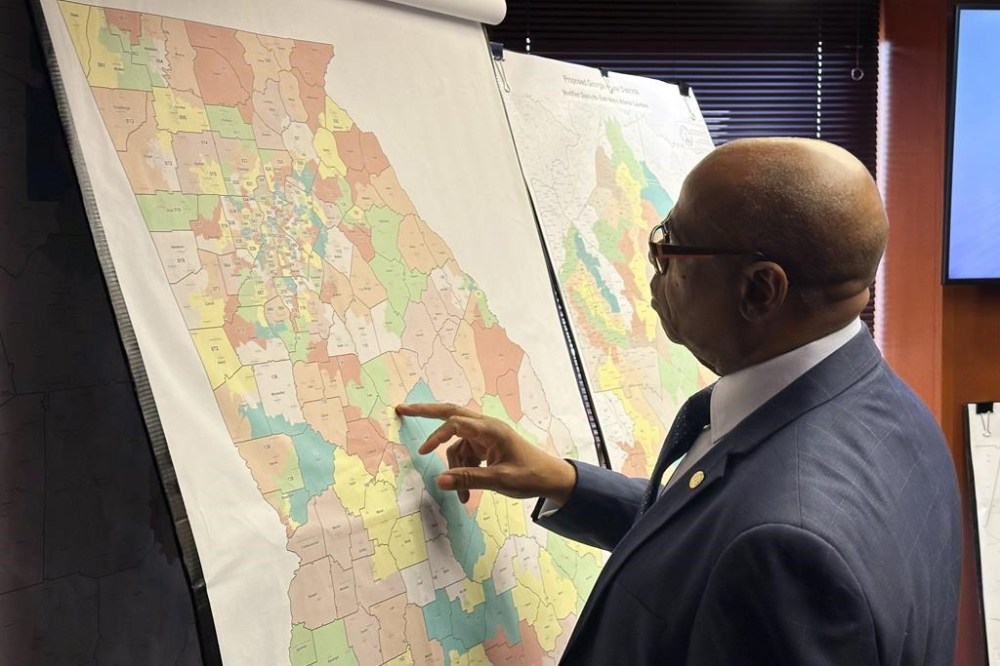 FILE - Georgia state Rep. Mack Jackson, D-Sandersville, looks at a map of proposed state House districts at the Georgia Capitol in Atlanta, Nov. 29, 2023. (AP Photo/Jeff Amy, File)