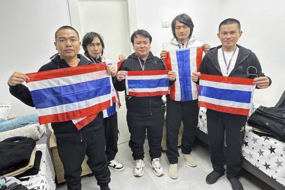 CORRECTS ID - Thai hostages who were freed from Hamas, from left to right, Surasak Rumnao, Sathian Suwannakham, Bannawat Saethao, Watchara Sriaoun, and Pongsak Thaenna hold the Thailand flag in Israel, Thursday, Jan. 30, 2025. (Royal Thai Embassy in Tel Aviv via AP)