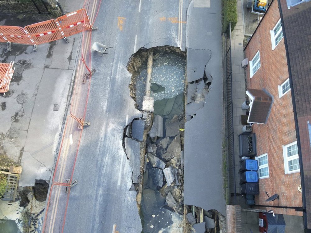 LONDON (AP) — Residents in an English village were kept out of their homes Wednesday as experts tried to shore up a large sinkhole that swallowed up parts of the main street up to the edge of at least two residential buildings.