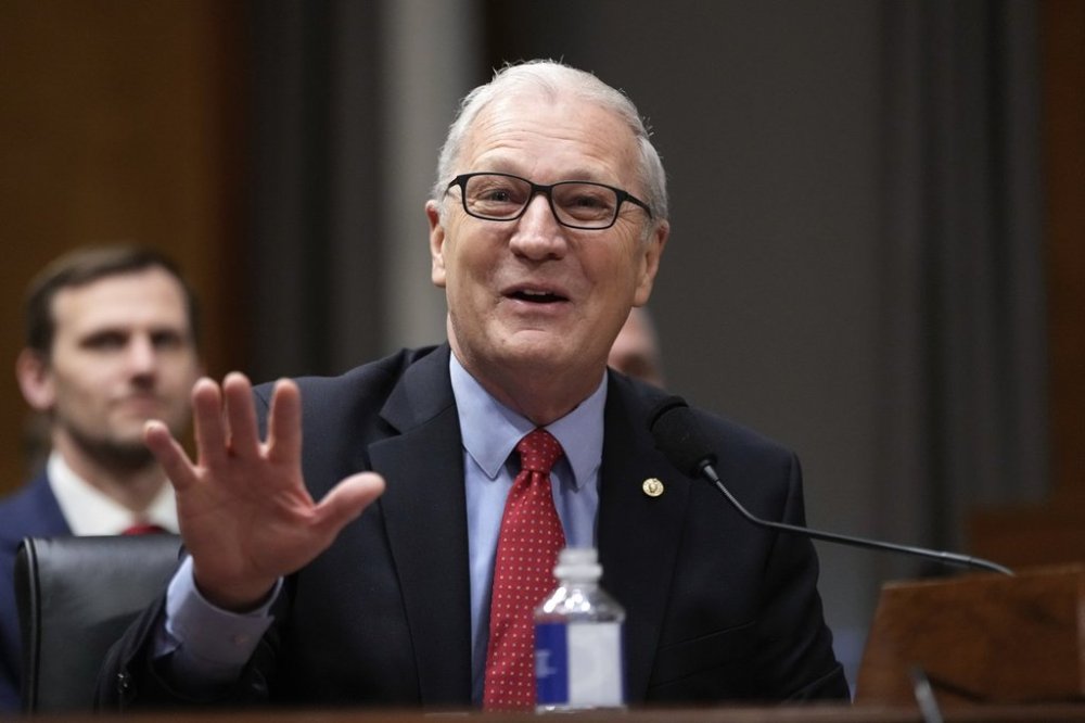 FILE - Sen. Kevin Cramer, R-N.D., introduces South Dakota Gov. Kristi Noem, President-elect Donald Trump's nominee to be Secretary of Homeland Security, appearing before the Senate Homeland Security and Governmental Affairs Committee for her confirmation hearing, at the Capitol in Washington, Friday, Jan. 17, 2025. (AP Photo/Ben Curtis, File)