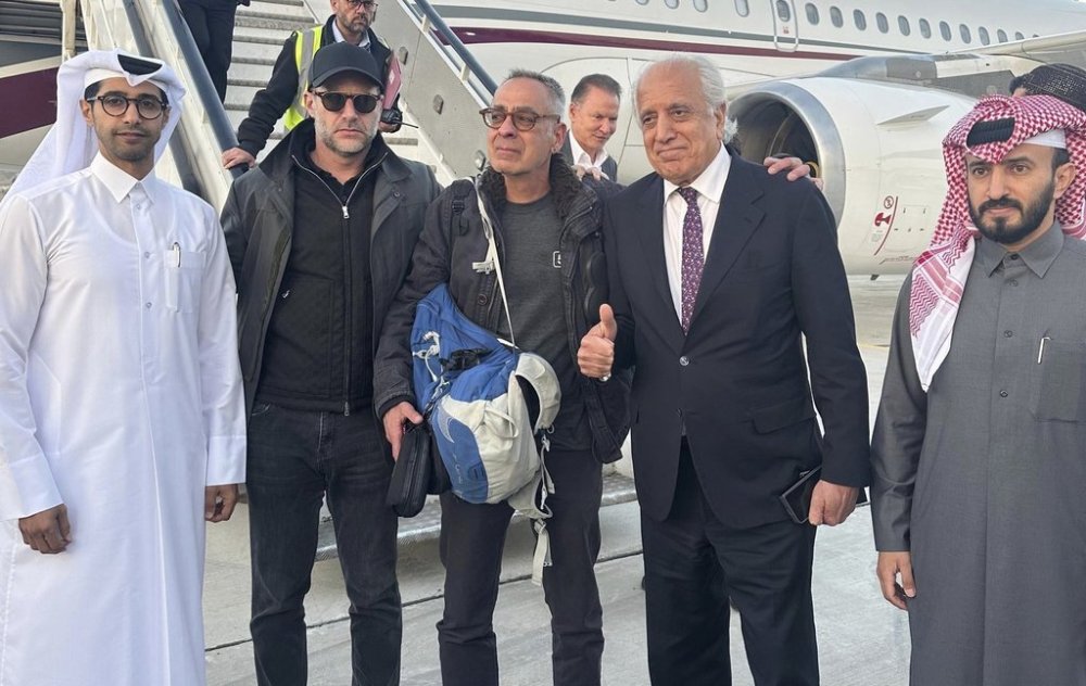 In this handout photo released by Qatar Ministry of Foreign Affairs, George Glezmann, center, poses with Adam Boehler, second left, and Zalmay Khalilzad, second right, and Qatari diplomats in Kabul, Afghanistan, Thursday, March 20, 2025, before departing to Doha, Qatar. (Qatar Ministry of Foreign Affairs via AP)