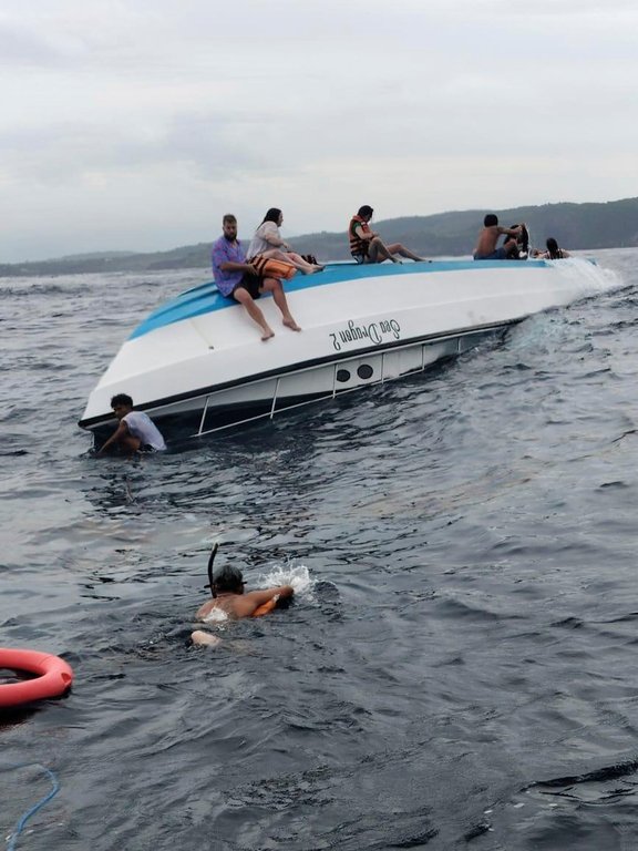 The group was looking at underwater scenery when their boat was hit by a large wave that threw a 39-year-old woman, identified by police as Anna Maree, overboard. It was followed by a second wave that capsized the boat in Kelingking waters, Widiono said.