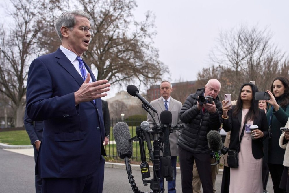 FILE - Treasury Secretary Scott Bessent speaks with reporters at the White House, March 13, 2025, in Washington. (AP Photo/Evan Vucci, File)
