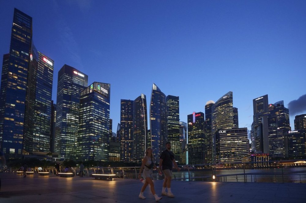 FILE - Tourists walk in front of the Central Business District during sunset in Singapore, on May 30, 2024. (AP Photo/Vincent Thian, File)