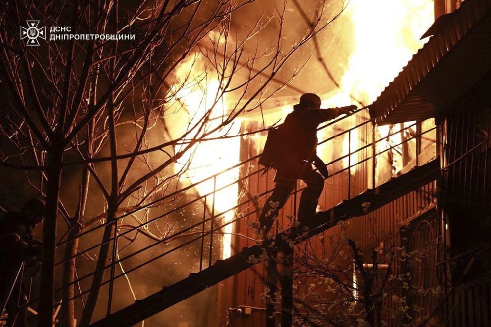 In this photo, provided by the Ukrainian Emergency Service, firefighters extinguish fire following a Russian attack in Dnipro, Thursday, April 17, 2025. (Ukrainian Emergency Service via AP)