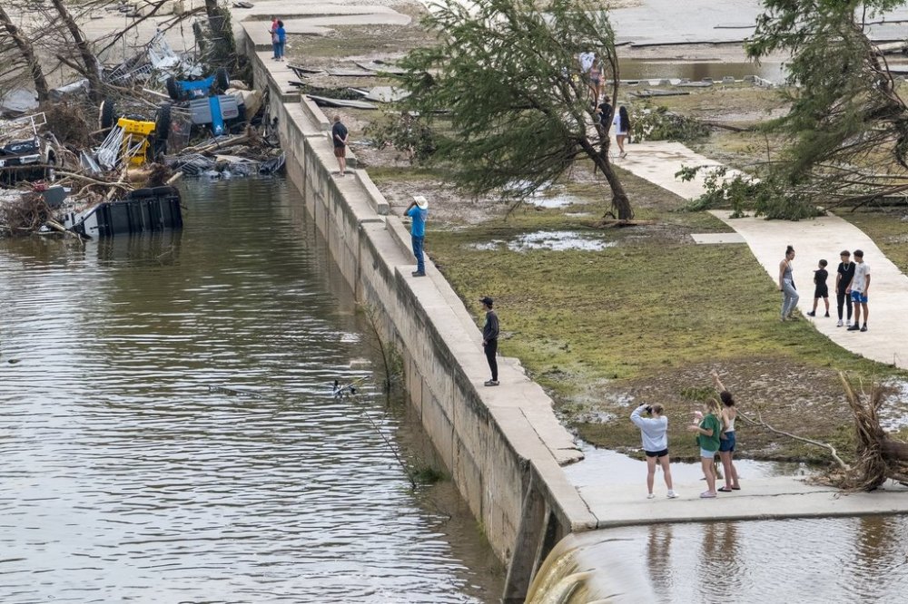 Onlookers walk along the banks of the Guadalupe River in Louise Hays Park, Saturday, July 5, 2025, in Kerrville, Texas. (AP Photo/Rodolfo Gonzalez)