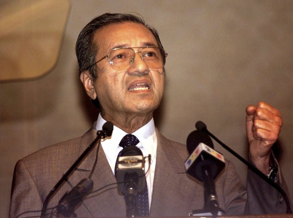 FILE - Malaysian Prime Minister Mahathir Mohamad speaks during the International Symposium on Currency Controls and Asian Monetary Cooperation in Kuala Lumpur, Sept. 2, 1999. (AP Photo/Vincent Thian)