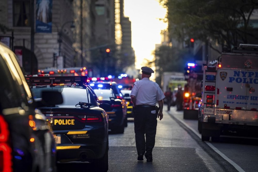 Surveillance video showed the man exiting a double-parked BMW just before 6:30 p.m. carrying an M4 rifle, then marching across a public plaza into the building. Then, he started firing, Tisch said, killing a police officer working a corporate security detail and then hitting a woman who tried to take cover as he sprayed the lobby with gunfire.
