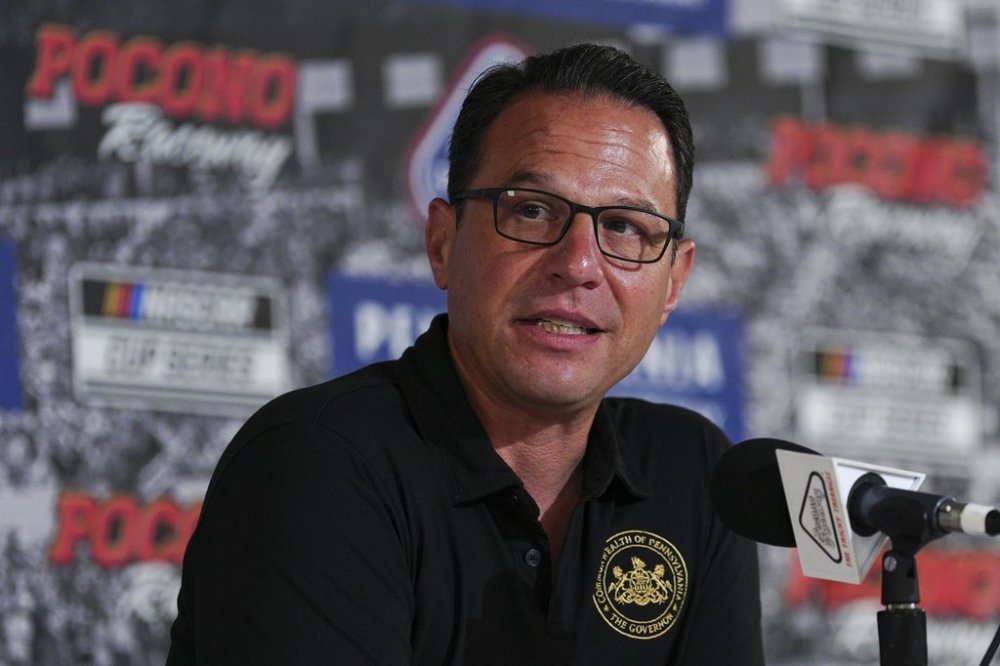 FILE - Pennsylvania Gov. Josh Shapiro talks to the media prior to a NASCAR Cup Series auto race at Pocono Raceway, Sunday, June 22, 2025, in Long Pond, Pa. (AP Photo/Derik Hamilton, File)