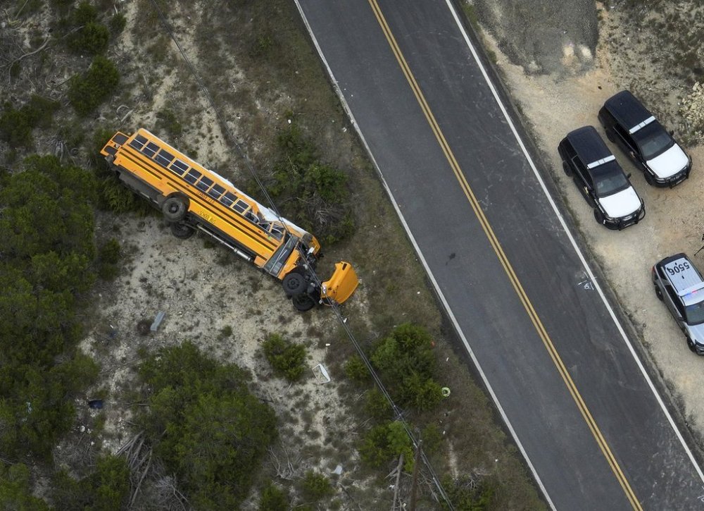 LEANDER, Texas (AP) — A Texas school bus carrying more than 40 students on Wednesday rolled over after veering off a rural road on the first day of class, injuring multiple students, authorities said.