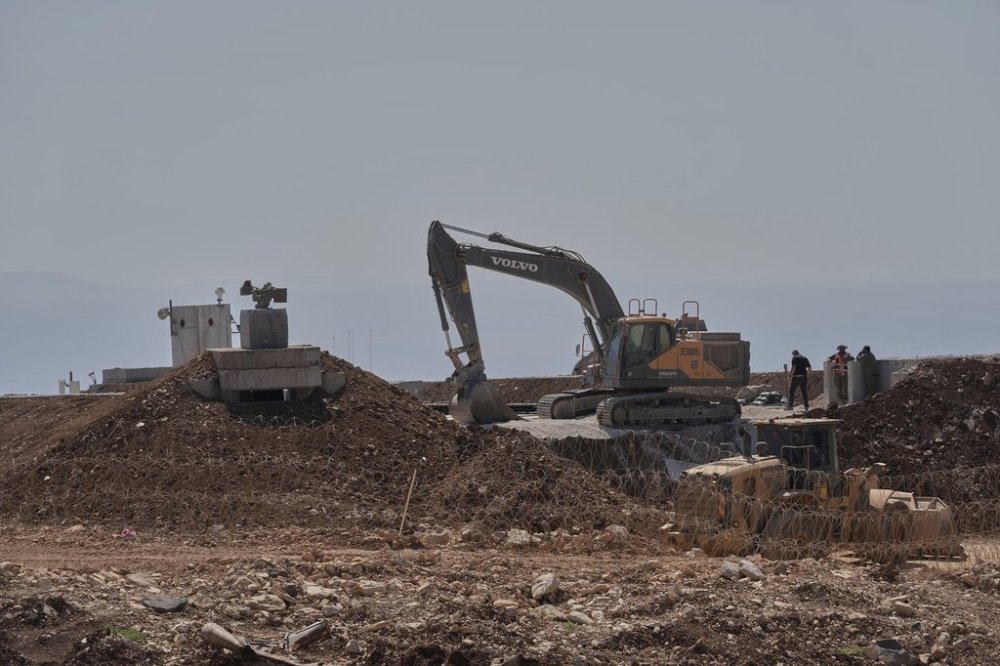 Workers stand beside a bulldozer at one of five new Israeli army positions built inside Lebanese territory along the road between Houla and Kfar Kila following airstrikes and a ground offensive that destroyed nearby villages, southern Lebanon, Wednesday, Aug. 20, 2025.(AP Photo/Hussein Malla)