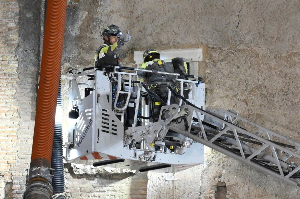 Hundreds of tourists had gathered to watch as firefighters used a mobile ladder to bring a stretcher to the upper level of the Torre dei Conti during the first rescue attempt. Suddenly, another part of the structure crumbled, sending up a cloud of debris and forcing firefighters to quickly descend.