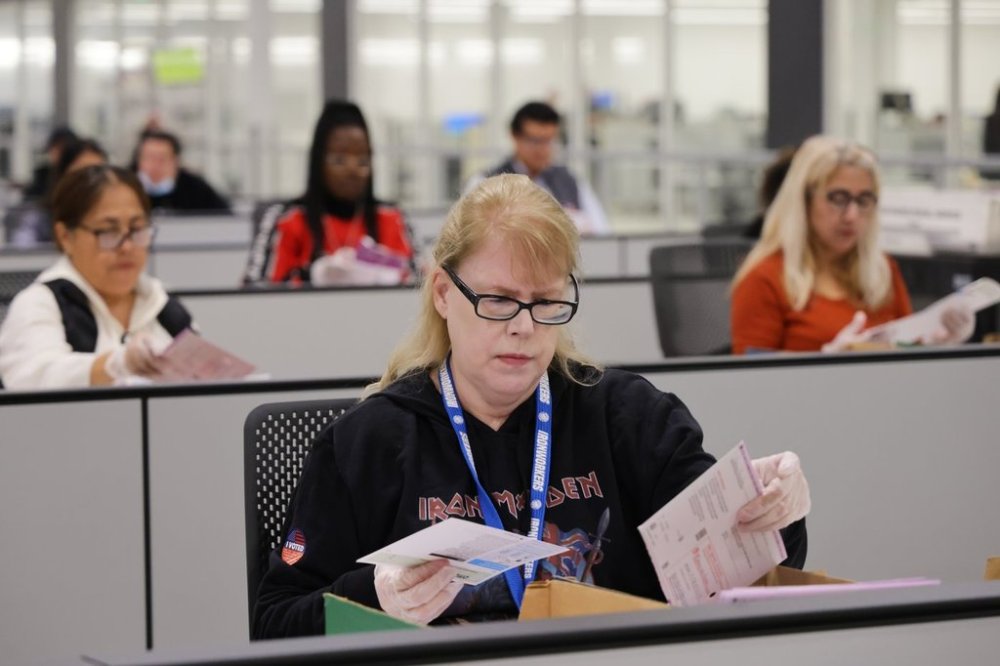 A worker examines ballots at the L.A. County Ballot Processing Center on Tuesday, Nov. 4, 2025, in City of Industry, Calif. (AP Photo/Ethan Swope)